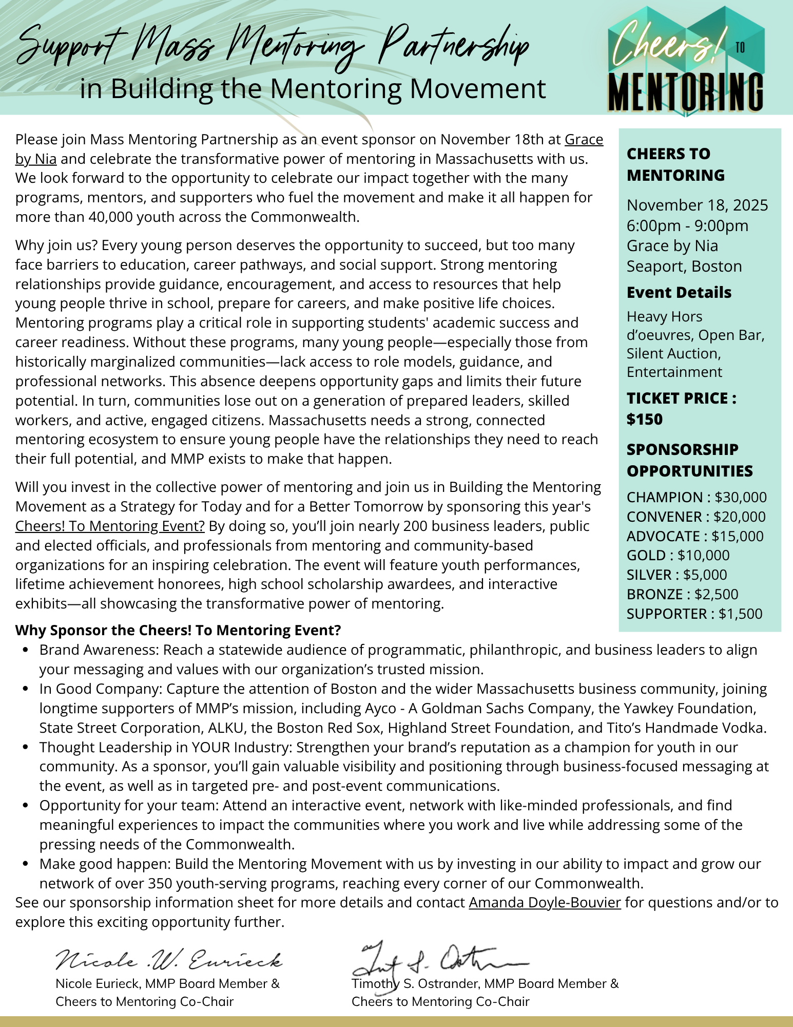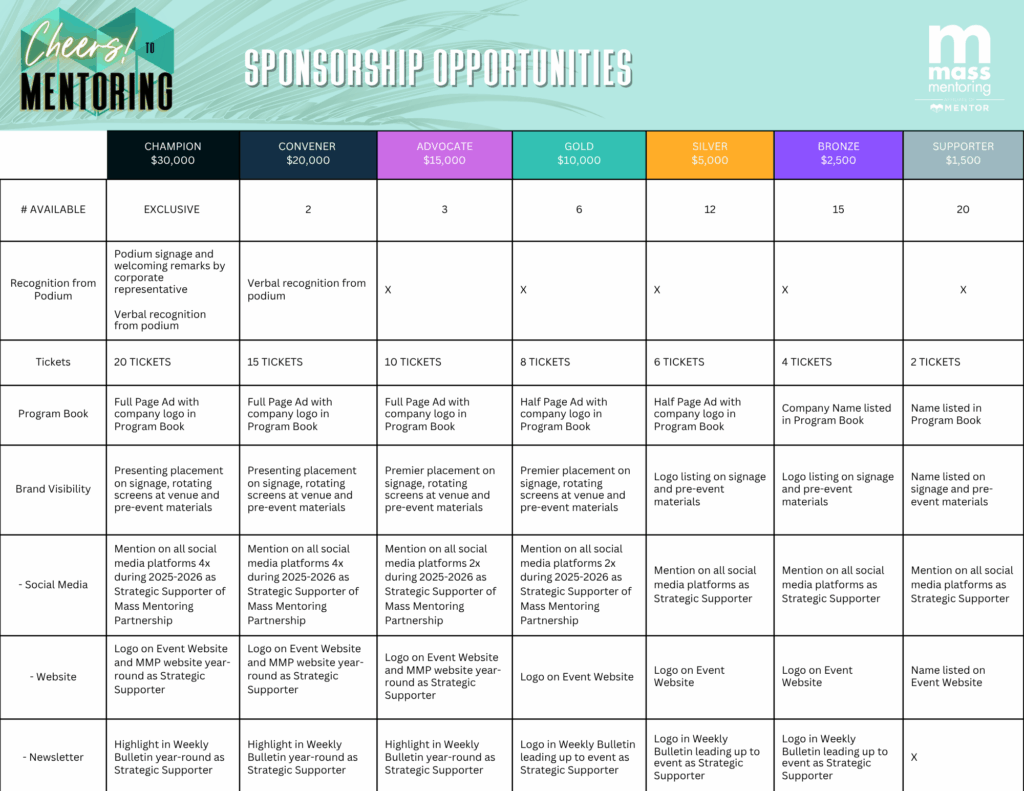For more information or questions about sponsorship, or to request an invoice for your sponsorship, please email Amanda Doyle-Bouvier at adoylebouvier@massmentors.org.