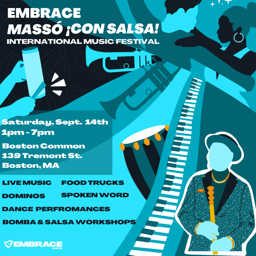The Embrace Massó “¡Con Salsa!” International Music Festival (EMCS) is an electrifying celebration of music, culture, and social justice. EMCS embodies Embrace Boston’s commitment to social change through the universal language of community, music, and placemaking. This dynamic event showcases the rich diversity of Latin and global rhythms, melodies, and traditions, uniting performers and audiences from around the world in a spirit of harmony and solidarity.